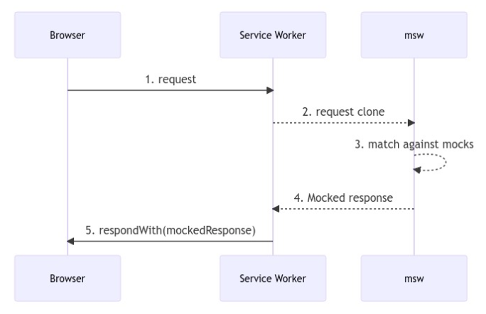 3. 그러면 등록된 핸들러를 통해 모의 응답(Mocked response)을 제공받을 수 있다. 제공받은 모의 응답은 브라우저에게 그대로 전달한다.