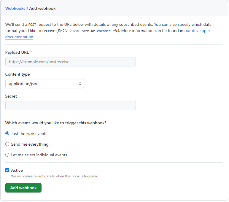 - Payload URL : 복사한 URL을 붙여넣어주고 뒤에 '/github'을 추가해준다.
