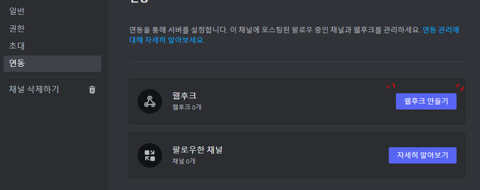 2. 설정 버튼 클릭 후 '연동'으로 이동해서 웹후크를 만들어준다!
